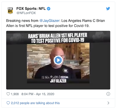 This news broke April 15, 2020. Notice the first COVID-19 case was a member of the ‘Rams’.