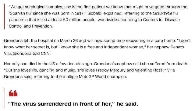 Notice how the story is about 102-year-old, Italica Grondona, battling coronavirus for 20-days, in 2020.
