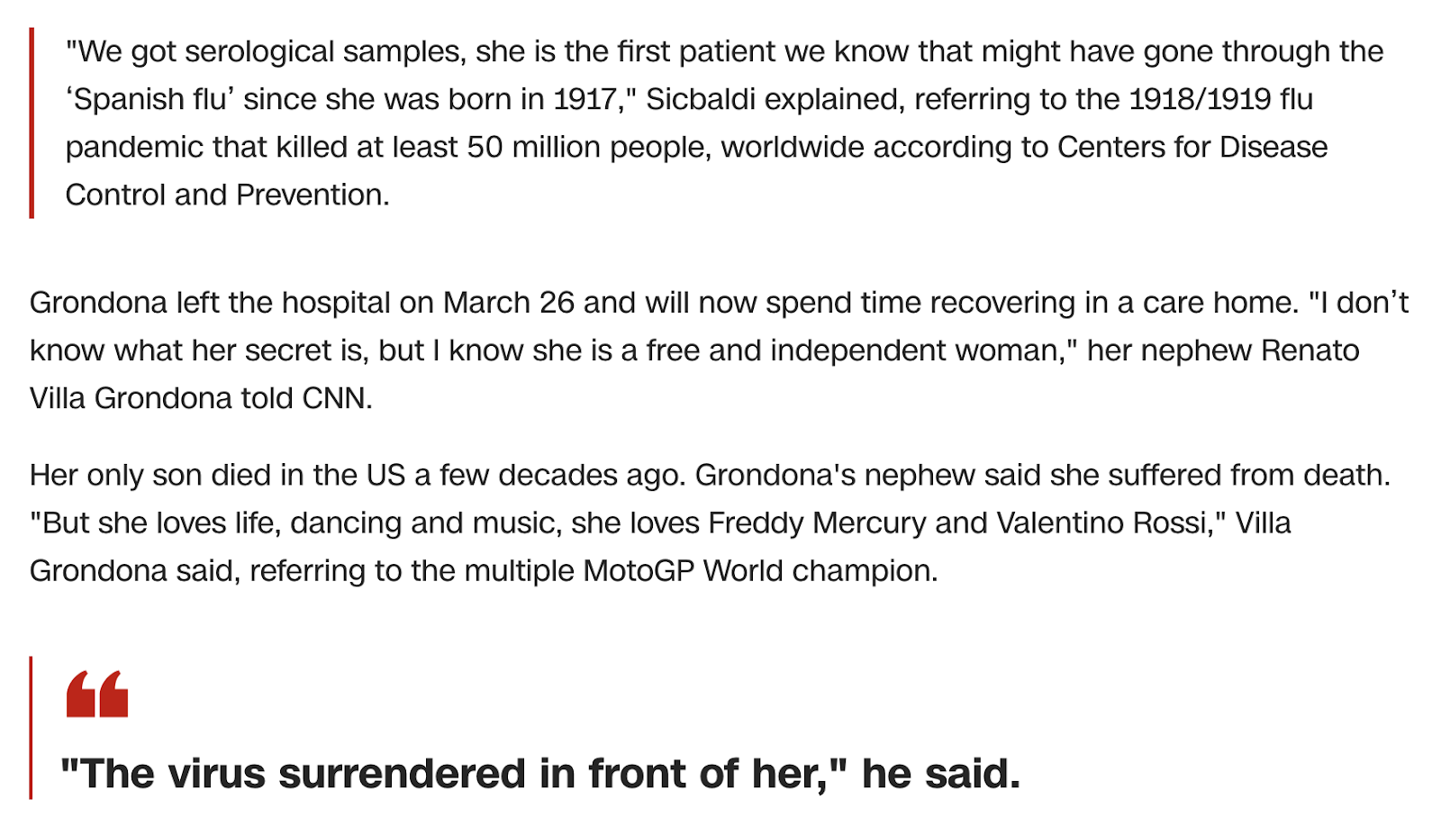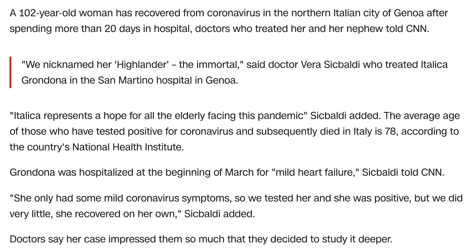 Notice how the story is about 102-year-old, Italica Grondona, battling coronavirus for 20-days, in 2020.