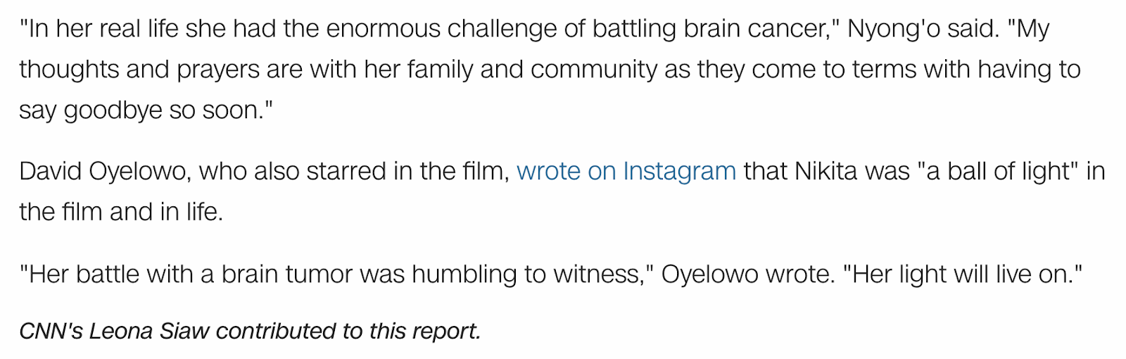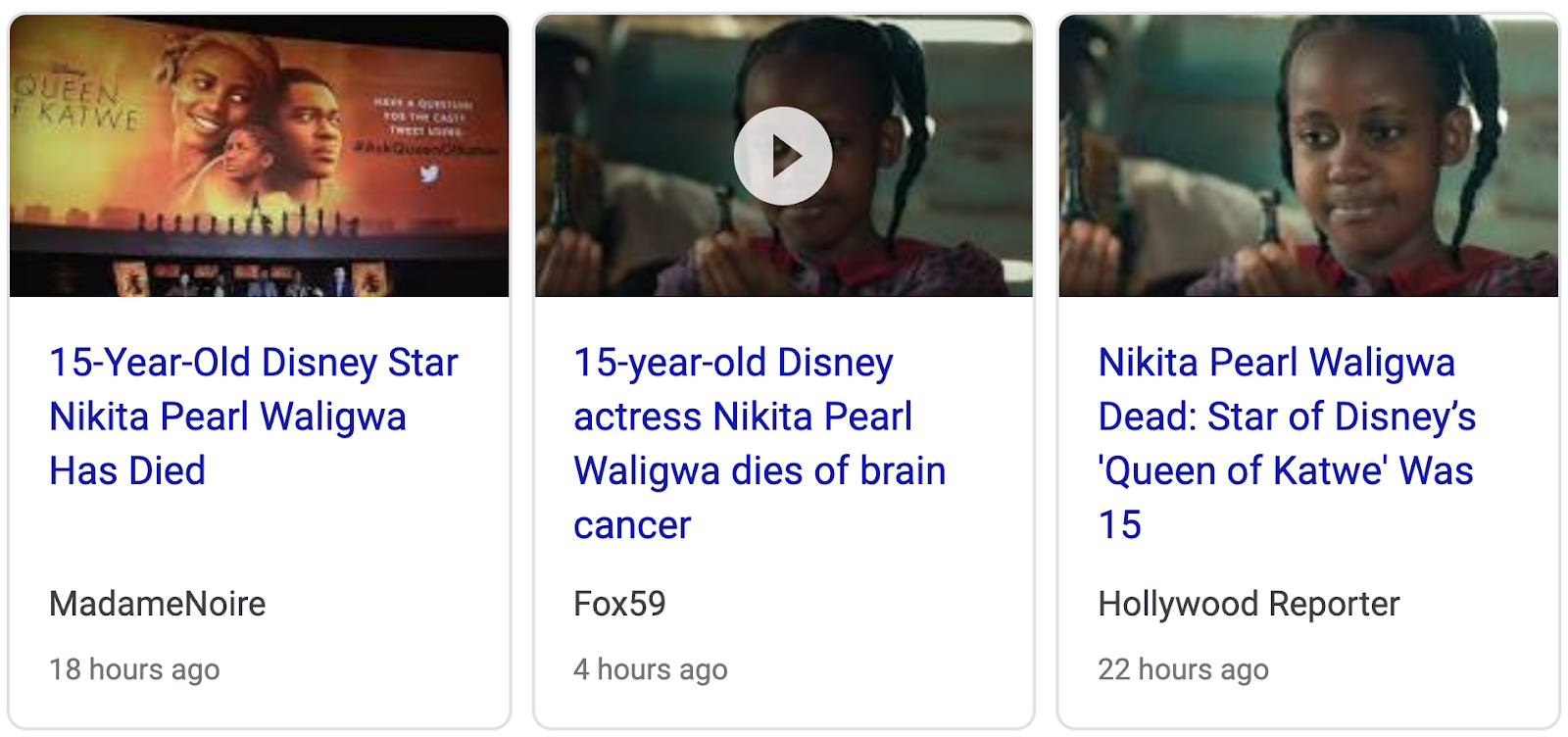 The death of this 15-year-old black actress, comes on the 15th of February, in ‘Black History’ month. Notice the film she starred in was the Queen of Katwe.
