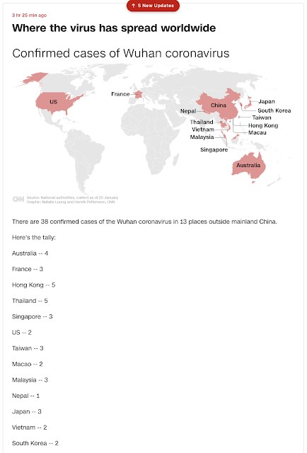 On January 25, 2020, the day of the Chinese New Year, we are told that the coronavirus has been confirmed in more than just China and the U.S., it has been confirmed worldwide, with 38 cases outside mainland China. Notice Pandemic sums to 38.