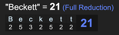 The name Beckett as well as the name of the mother who carried him, Julie, sum to 21.