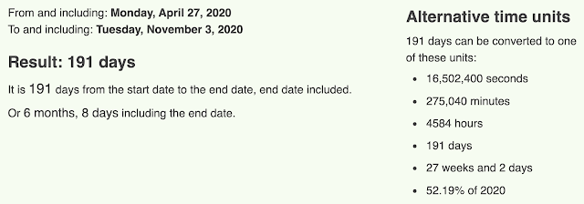 From April 27, 2020 to the election on November 3, is a span of 191 days later.