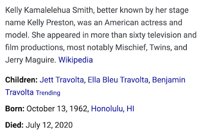 Actress Kelly Preston, dead at 57, July 12, 2020, John Travolta’s wife