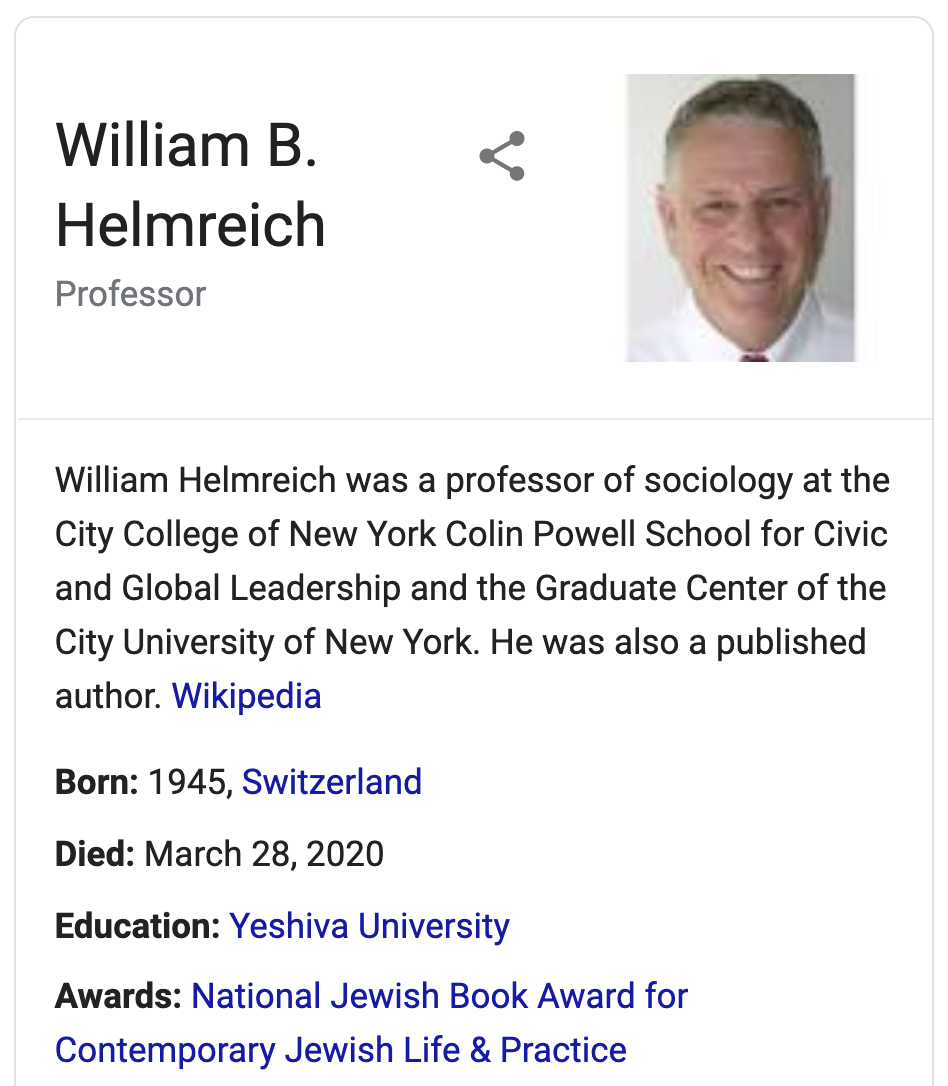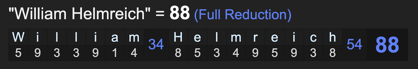 They’re reporting he died March 28, the 88th day of the year. Notice how his name William Helmreich sums to 88, like Jewish.