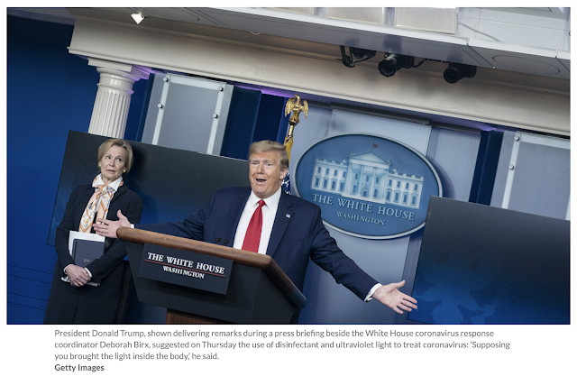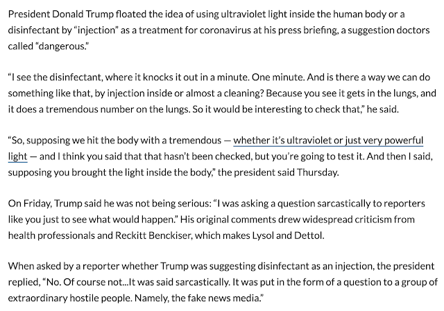 Actor President Trump’s disinfectant remarks on Thursday, April 23, 2020, clearly weren’t sarcastic, but I guarantee they were scripted