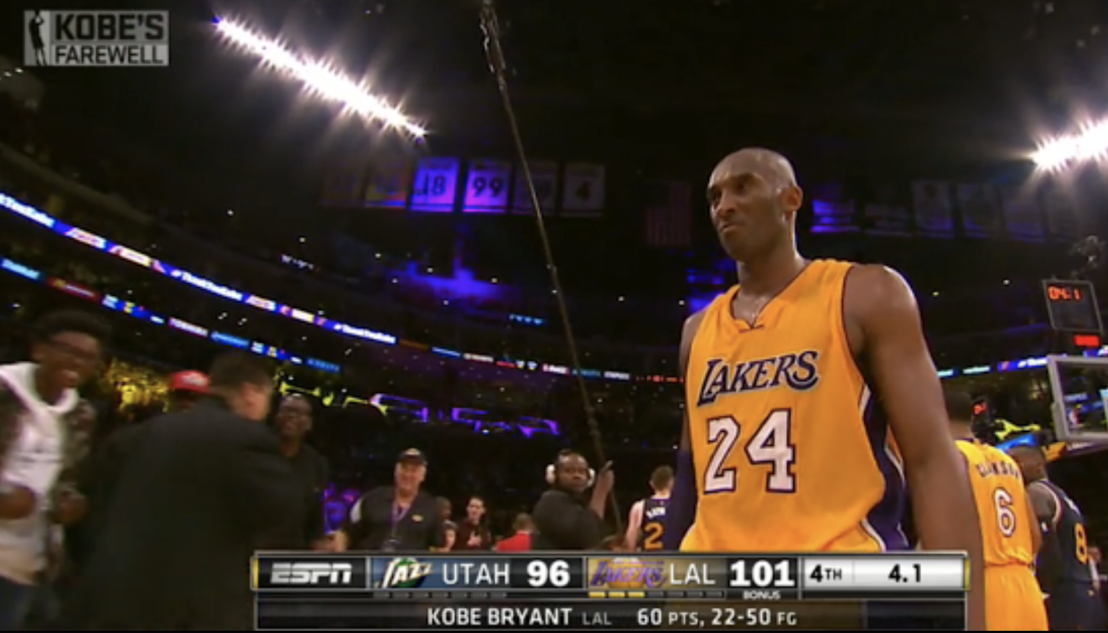 And never forget Kobe’s 81 point game, where the rest of his team scored 41, or his last game, where he scored 60, and again, the rest of team scored 41. In that game Kobe came off the court with 4.1 seconds left, and not by accident.