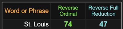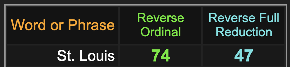 As for his story happening in St. Louis, the city has gematria of 47 and 74.