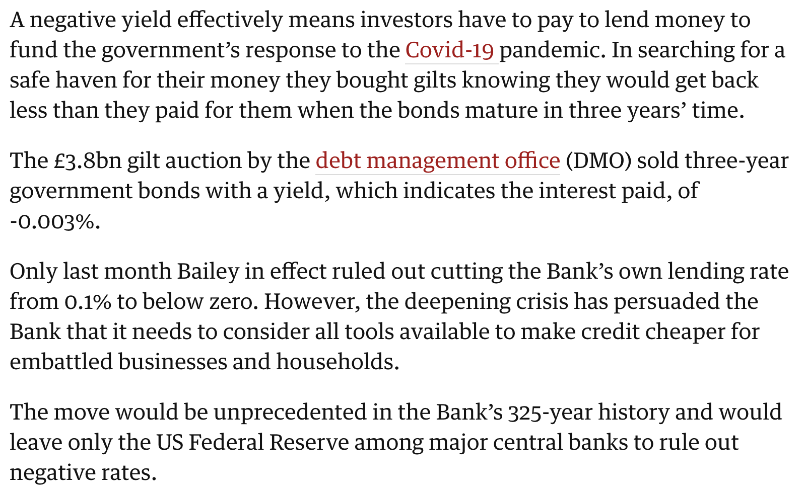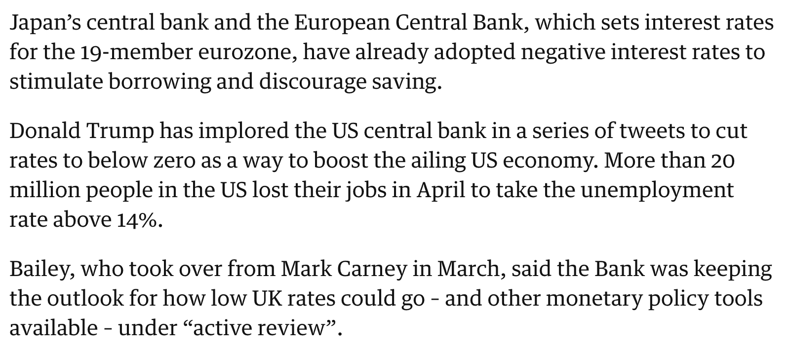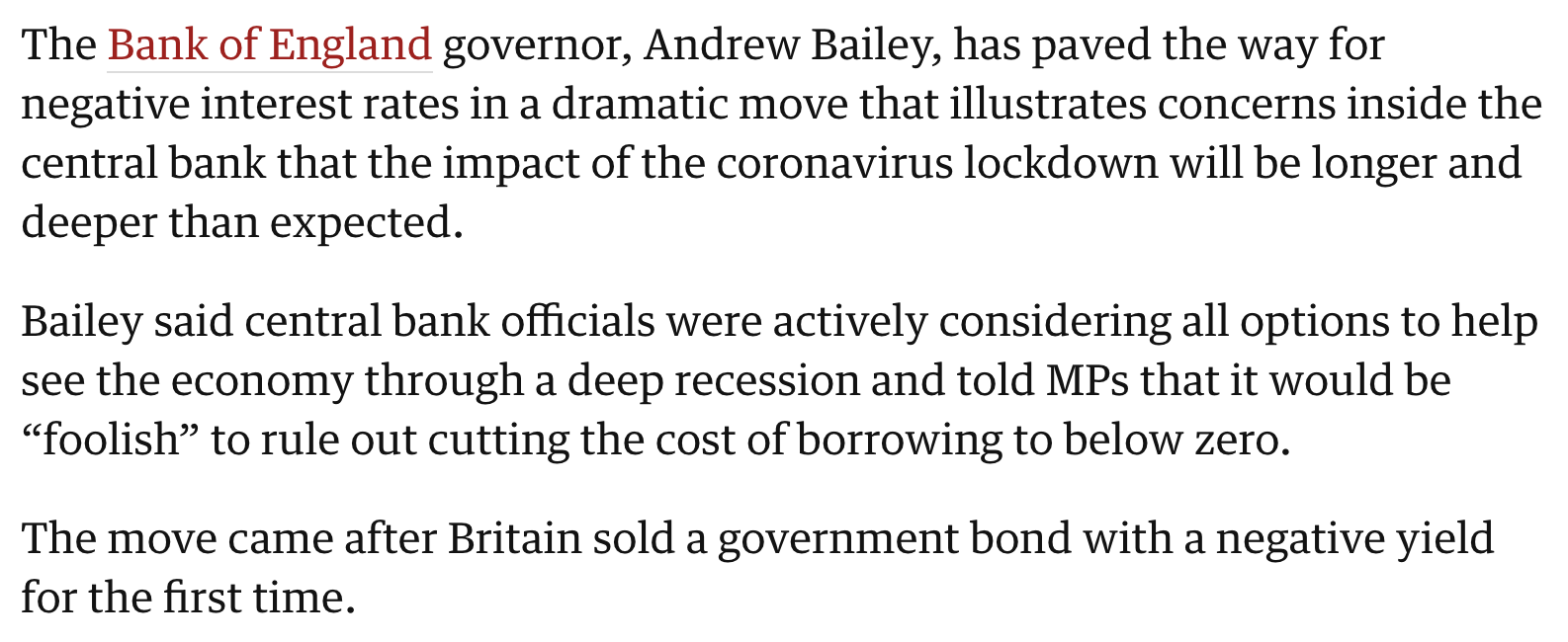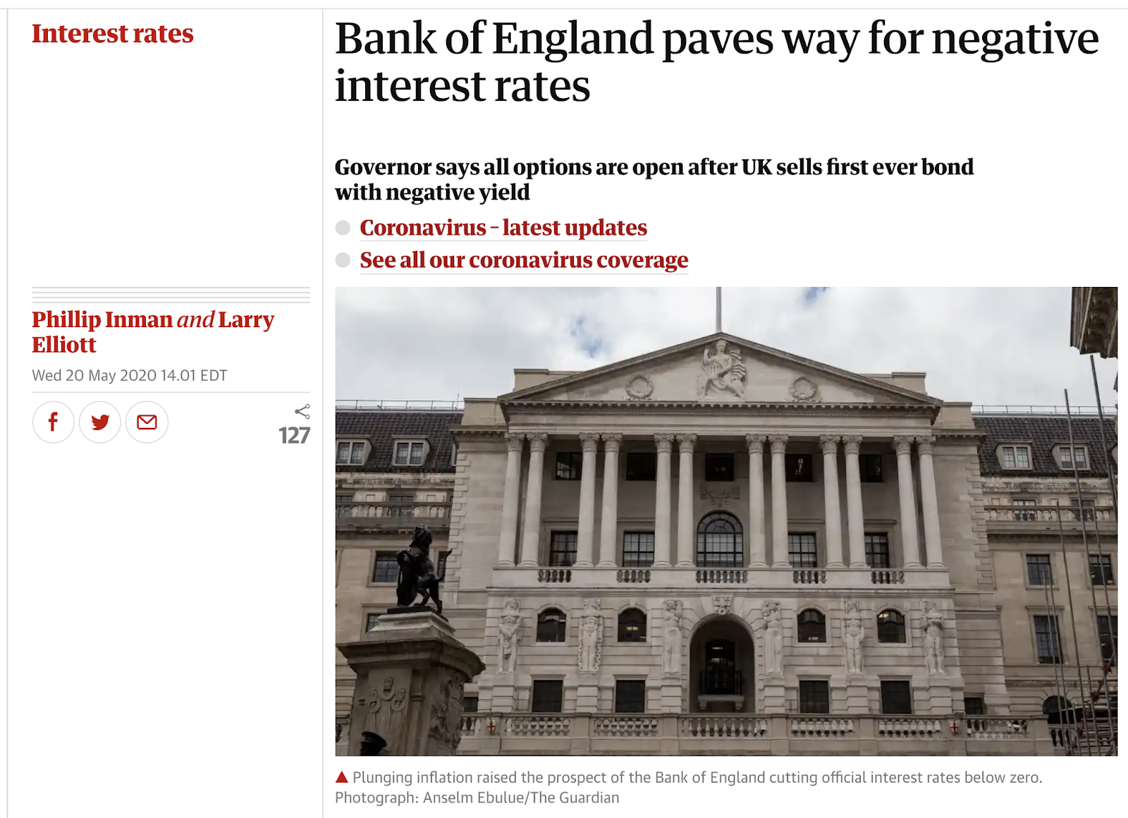 Bank of England paves way for negative interest rates, following Europe and Japan, May 20, 2020