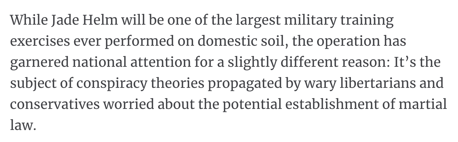 Recall Jade Helm, the biggest military drill in history on U.S. soil, simulating lockdown situations.  That took place not long ago, in 2015.