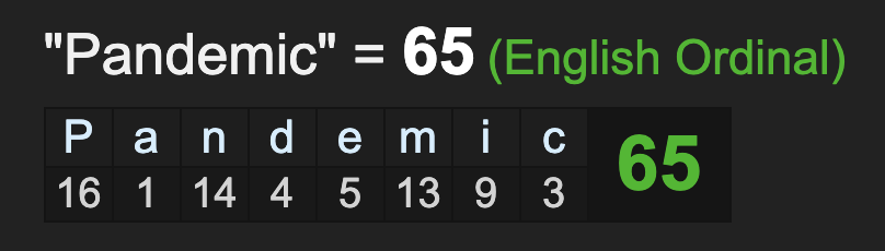3/22/2020 = 3+22+20+20 = 65