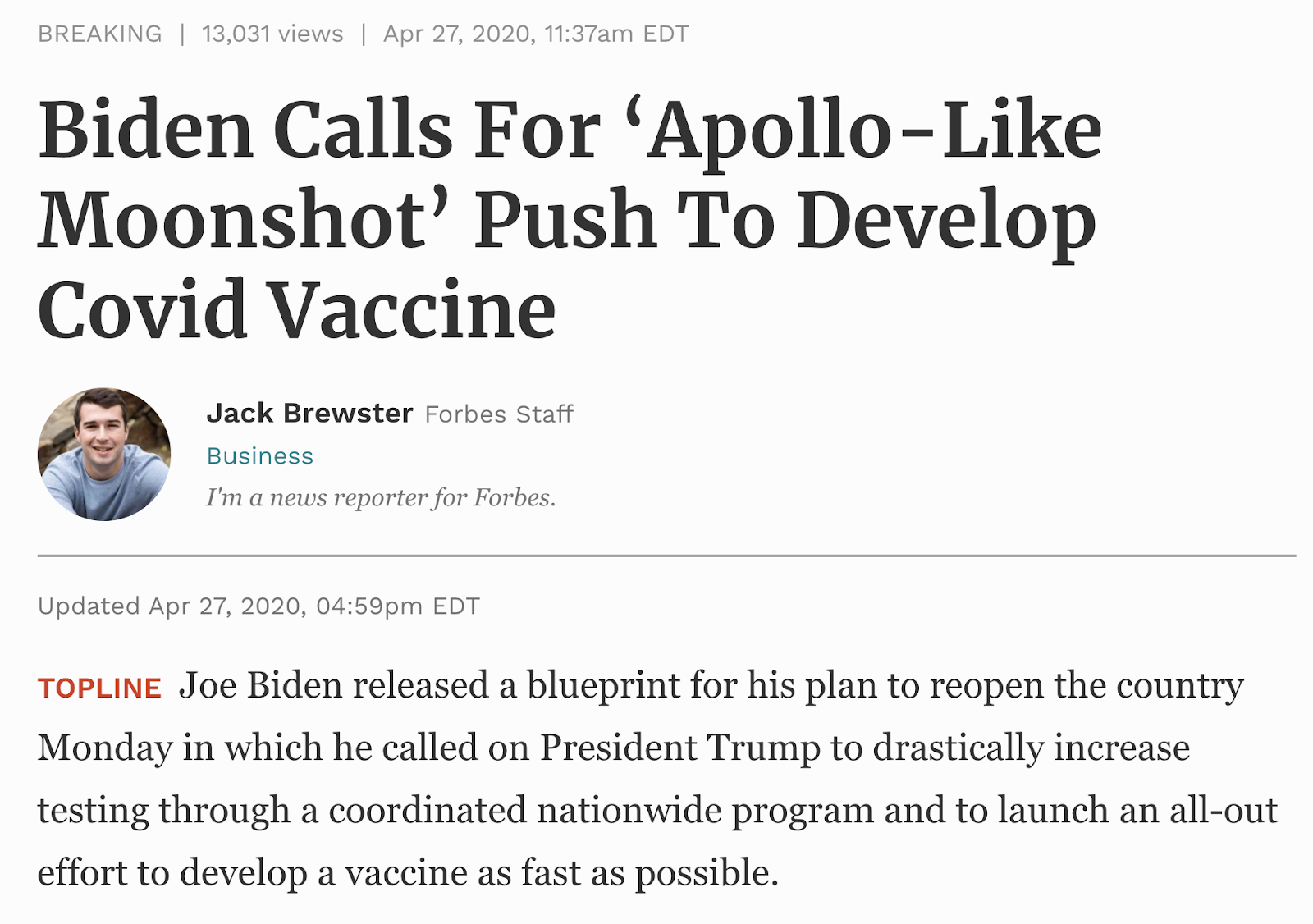 Biden calls for ‘Apollo-Like Moonshot’ push to develop Covid Vaccine, April 27, 2020, in tribute to 51st anniversary of moon landing, July 20-21, 2020