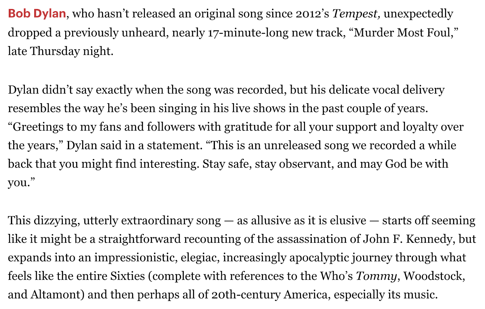 Let us begin with the title, Murder Most Foul. Keep in mind, Bob Dylan will turn 79 this year.