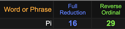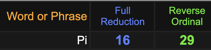 This matters because 53 is the 16th prime and Pi equates to 16 in gematria, as well as 29.  Of course he is dead on the 29th.