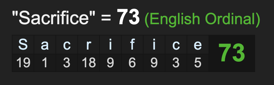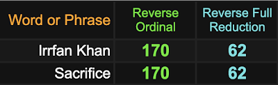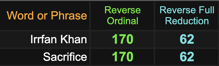 His actor name, Irrfan Khan, sums to 62 and 170, like sacrifice, and he died on a date with 73 numerology, another value equating with ‘sacrifice’.