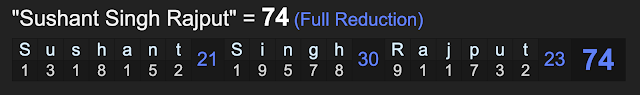 Notice, his name ‘Sushant Singh Rajput’ sums to 74, and he has died on his 146th day of his age, and on 14/6.