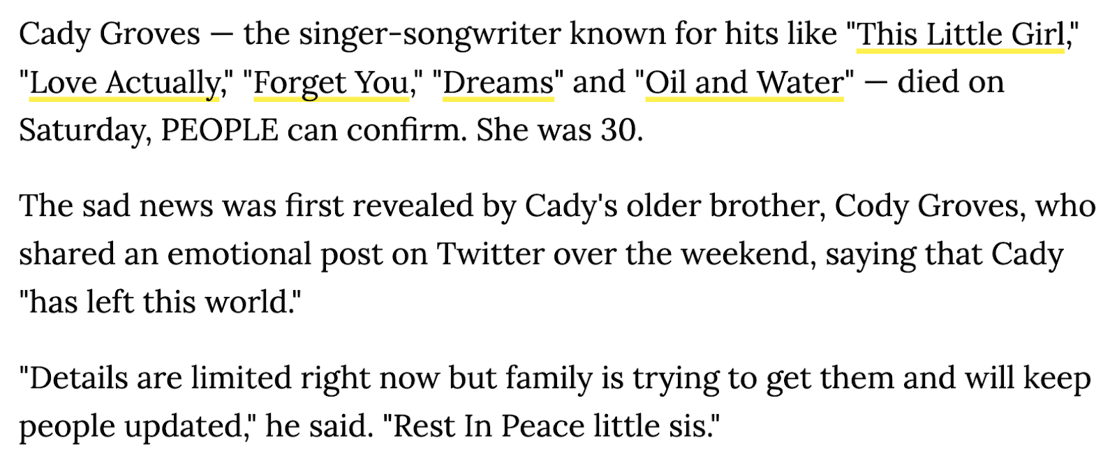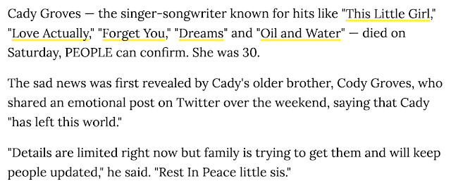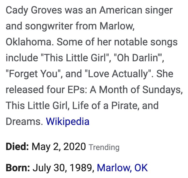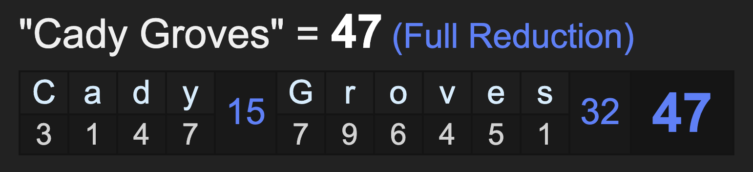 Cady Groves, a name summing to 47 in gematria, died on a date with 47 numerology.
