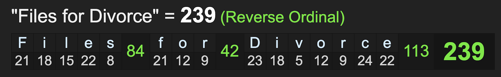 This use of celebrity is for the purpose of normalizing the idea of divorce to the mainstream. Thus, this is propaganda for the nation it exists in, ‘The United States of America’ summing to 261. Keep in mind September 18, the 261st day of the year, is a significant date in U.S. history, from the cornerstone for D.C. being laid, to the founding of the New York Times, to the date of the anthrax attacks after 9/11. In other words, there is significance to 261.