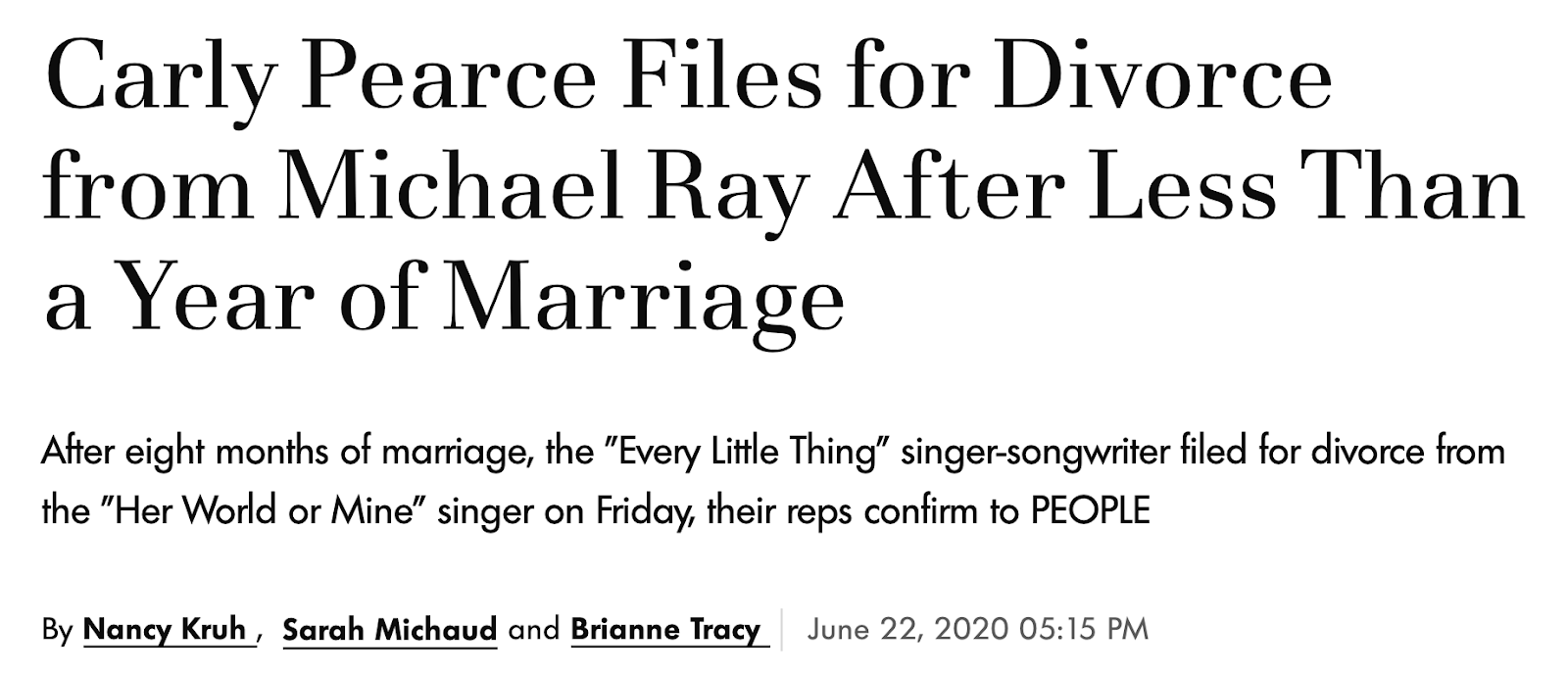 Carly Pearce files for divorce from Michael Ray 257-days after their wedding, June 19, 2020 (+June 22, 2020 news)