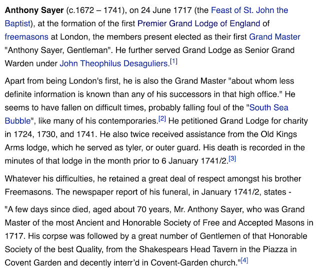 Anthony Sayer, the Grand Master of the Premier Grand Lodge of England, June 24, 1717