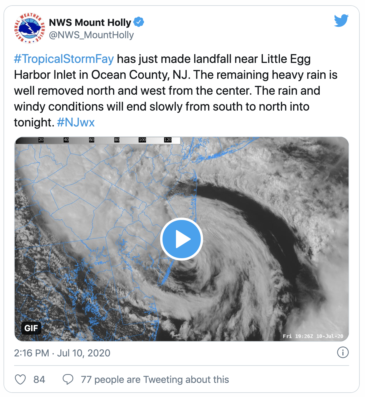 Tropical Storm Fay headlines July 9, and landfall on New Jersey July 10, 2020