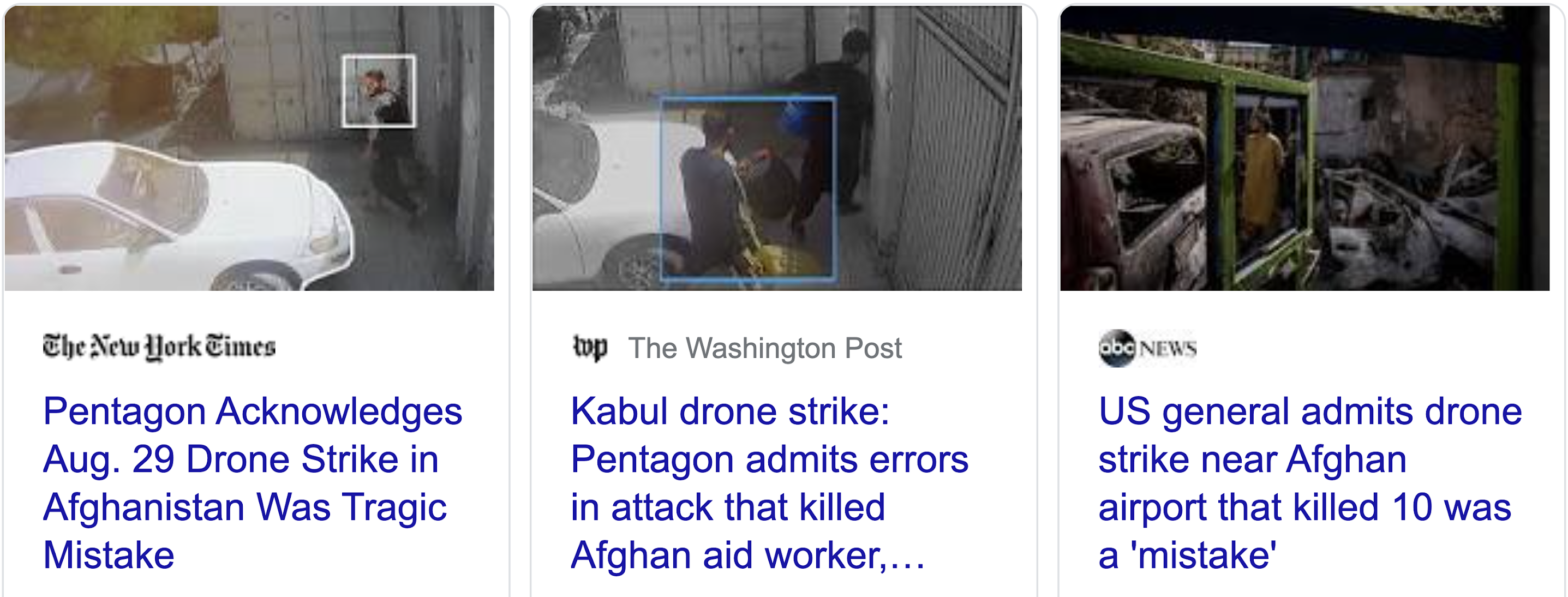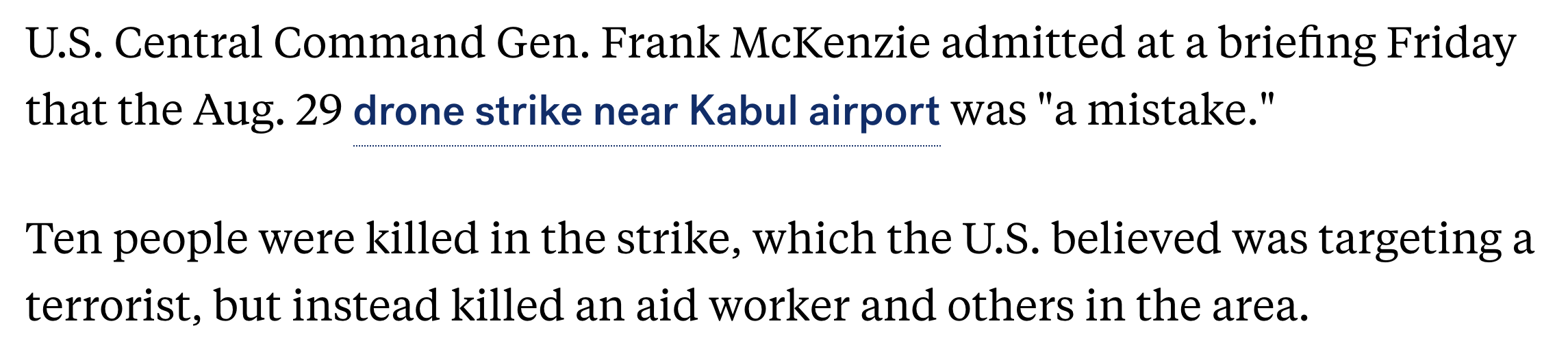 US military admits to accidentally killing 7 children and 3 adults, September 17, 2021 (19 days after ‘mistake’)