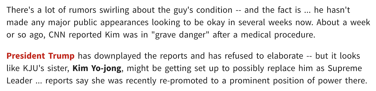Donald Trump’s June 30, 2019 meeting with Kim Jong Un, and Kim Jong Un’s announced death April 25, 2020, 43-weeks later