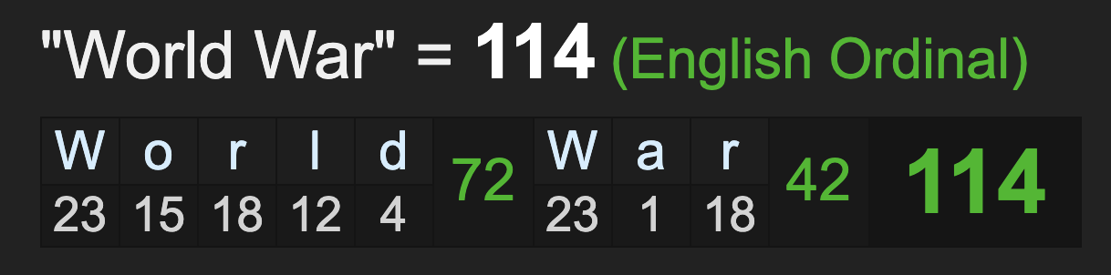 In light of the military ritual, keep in mind World War sums to 114.
