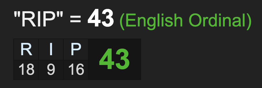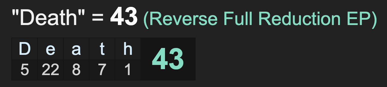 *4/14/20 = 4+14+20= 38 *Death = 4+5+1+20+8 = 38