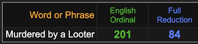 Notice the emphasis on ‘murdered by a looter’, summing to 201 and 84.