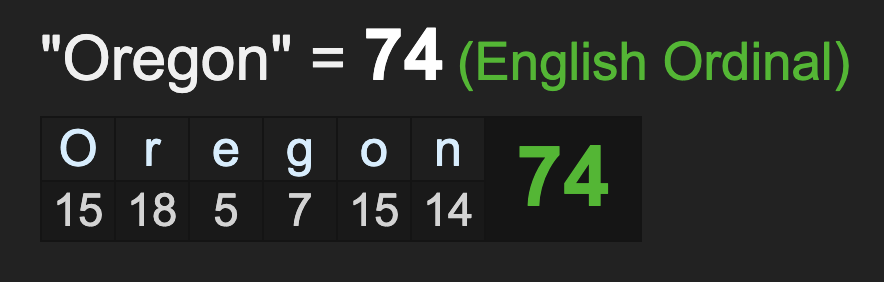 This isn’t hard to see through. Oregon is the only state that sums to 74 with Simple English Gematria.
