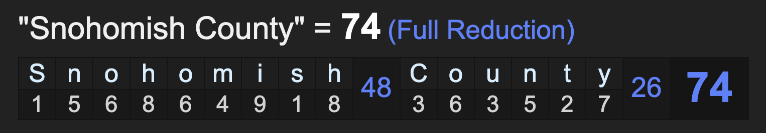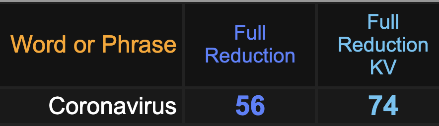 Patient Zero was discovered December 12, 2020, 56-days after Event 201. Coronavirus sums to 56, and when the master numerology of v (22) is observed, it sums to 74.