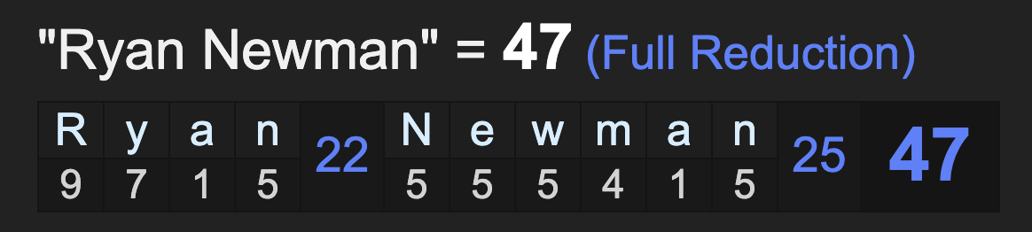47, which is THEE number of the 2020 Daytona 500, corresponds with the Gematria of Ryan Newman. *See prior work on the race and 47.
