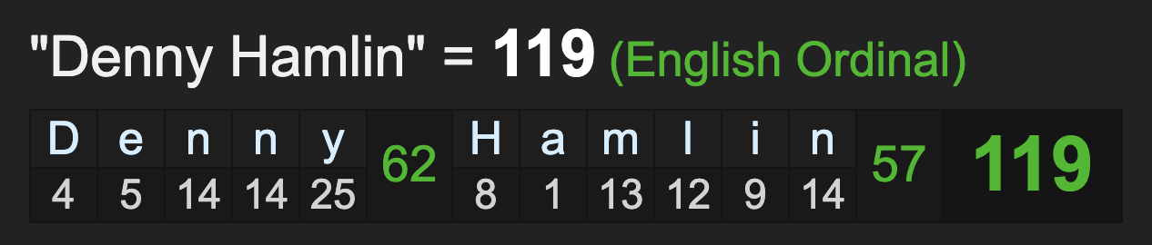 As for Denny Hamlin, the first back-to-back winner in 25-years, his birthday is November 18, the 322nd day of the year, the ‘Skull and Bones’ number.