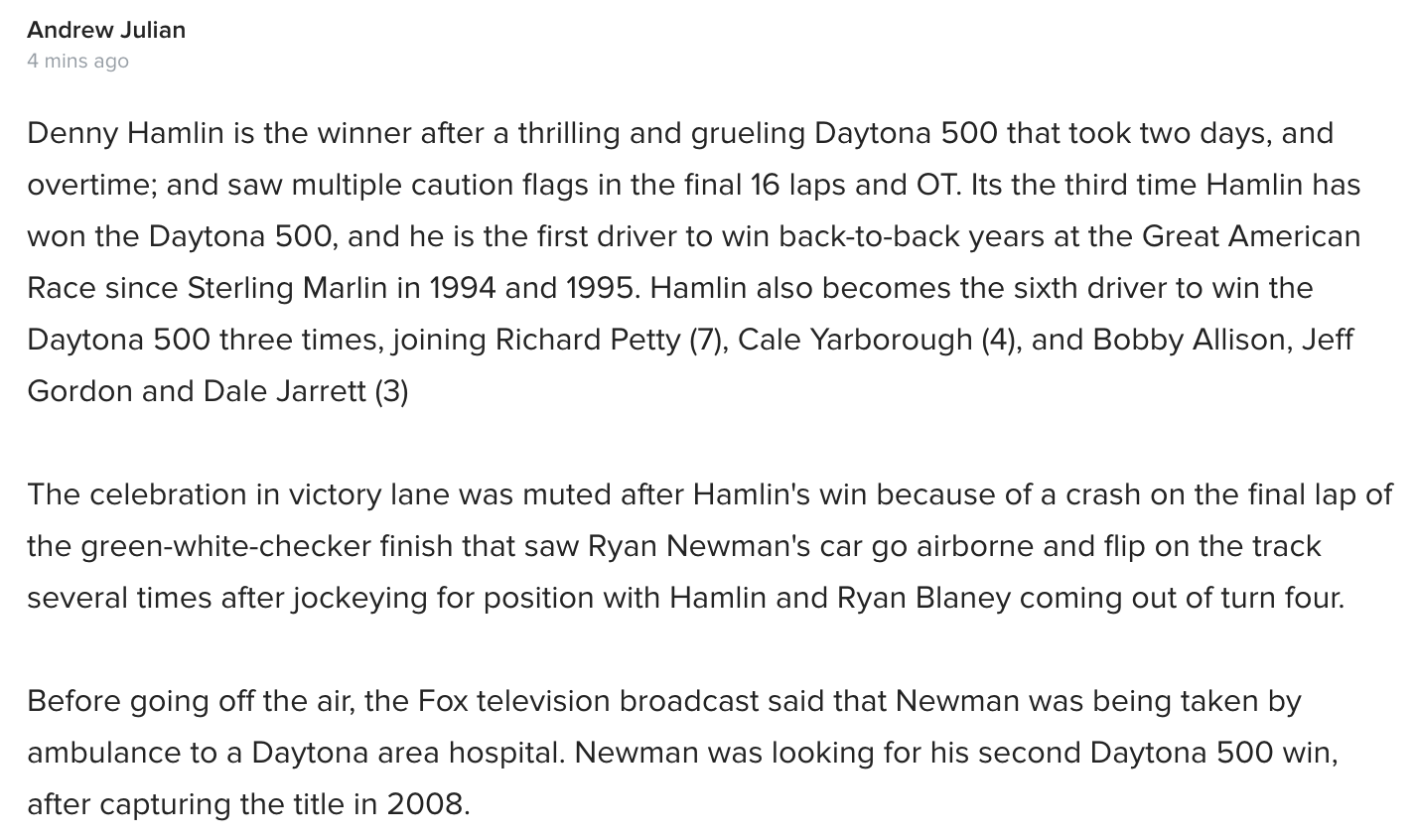 Denny Hamlin wins 2020 Daytona 500, becoming 6th racer to win the event 3 times, February 17, 2020