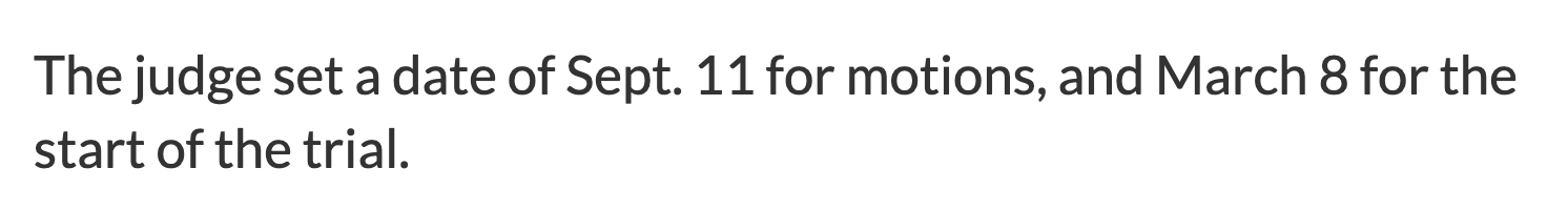 You will notice the date has been set for September 11, to begin the pretrial, leading up to the trial beginning on March 8, 2020. Two dates, that are two sick jokes. Starting with 38th.