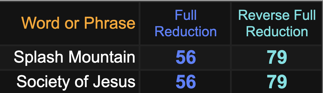 Splash Mountain and Society of Jesus both equate to 56 and 79.