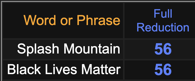 This is a tribute to Black Lives Matter. Notice how it and ‘Splash Mountain’ equate to 56.