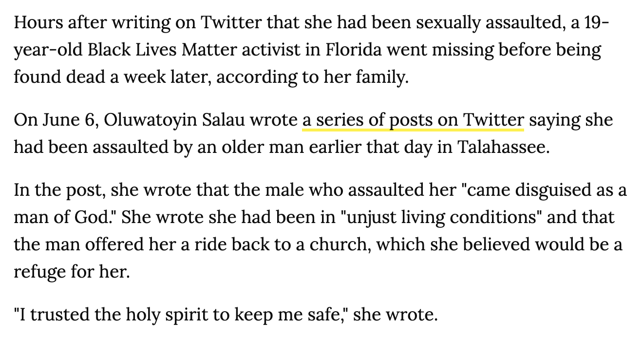 Oluwatoyin Salau, Black Lives Matter activist, found dead, after being lured into a church by a “man of God”, June 15, 2020 news