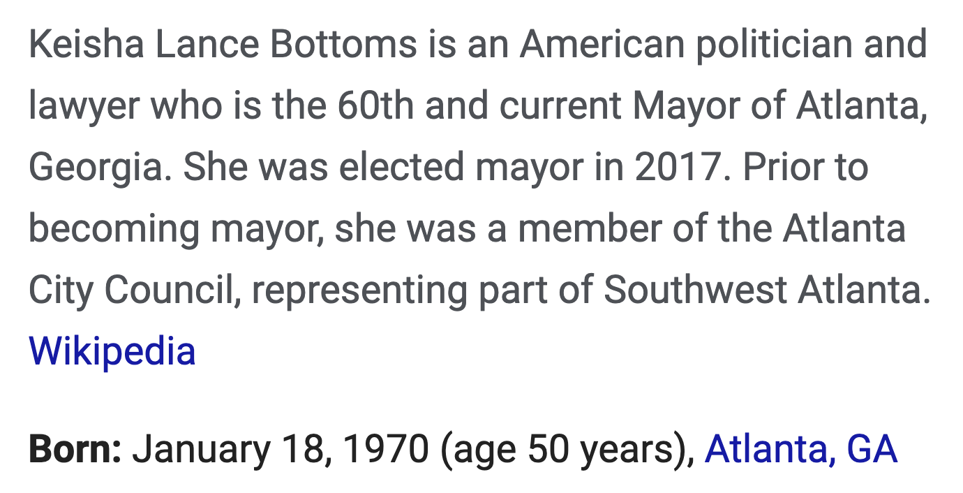Keisha Lance Bottoms, an interesting name for a black woman, a group known for having nice bottoms, has a January 18 birthday, or 18/1, like 181, the 42nd prime… *Jesuit = 42