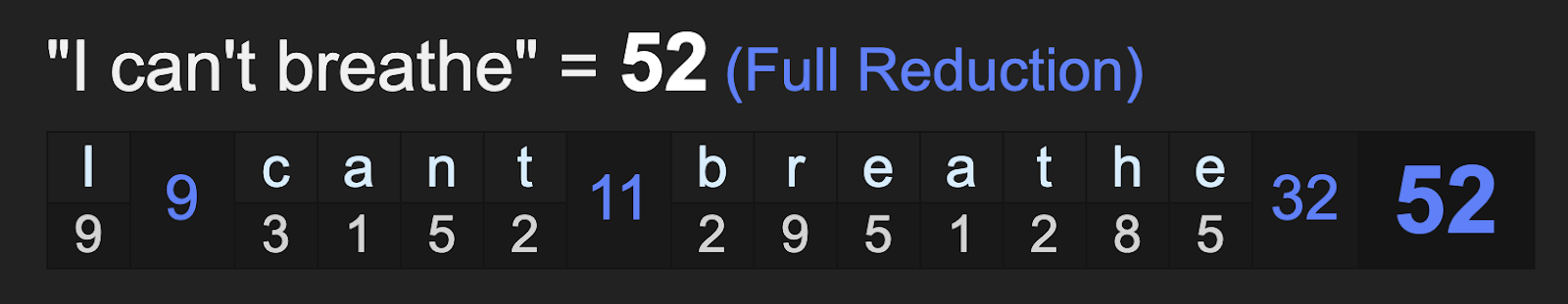 52 ties in with not only her name, but ‘I can’t breathe’, and ‘Minnesota’, where George Floyd *died.