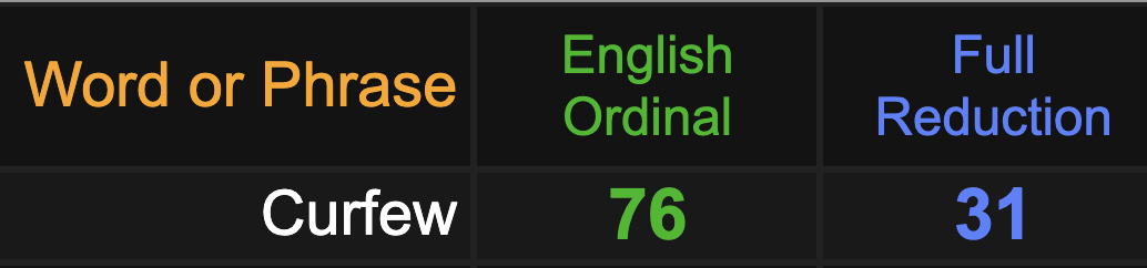 Curfews are being declared in cities across the nation, large and small. This is happening Sunday, May 31, 2020, a date with 76 numerology.