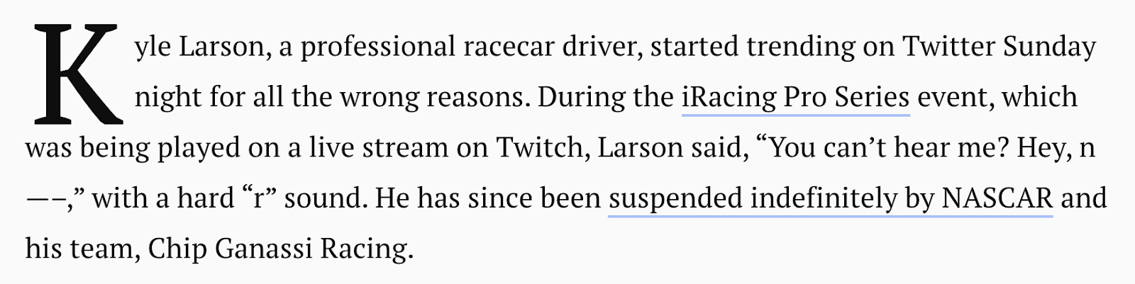 NASCAR driver Kyle Larson, #42 car, suspended for using N-word, April 12, 2020