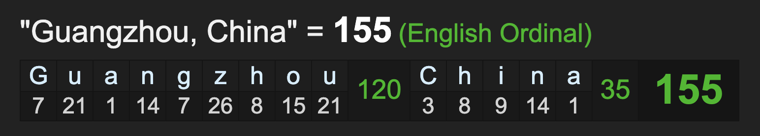Notice the the gematria of the location, Guangzhou, China, summing to 155, like coronavirus.