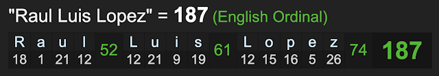 Speaking of 33, and the church, you might be reminded of Jesus, who died on the cross. Notice how his name, Raul Luis Lopez sums to 61 and 74…