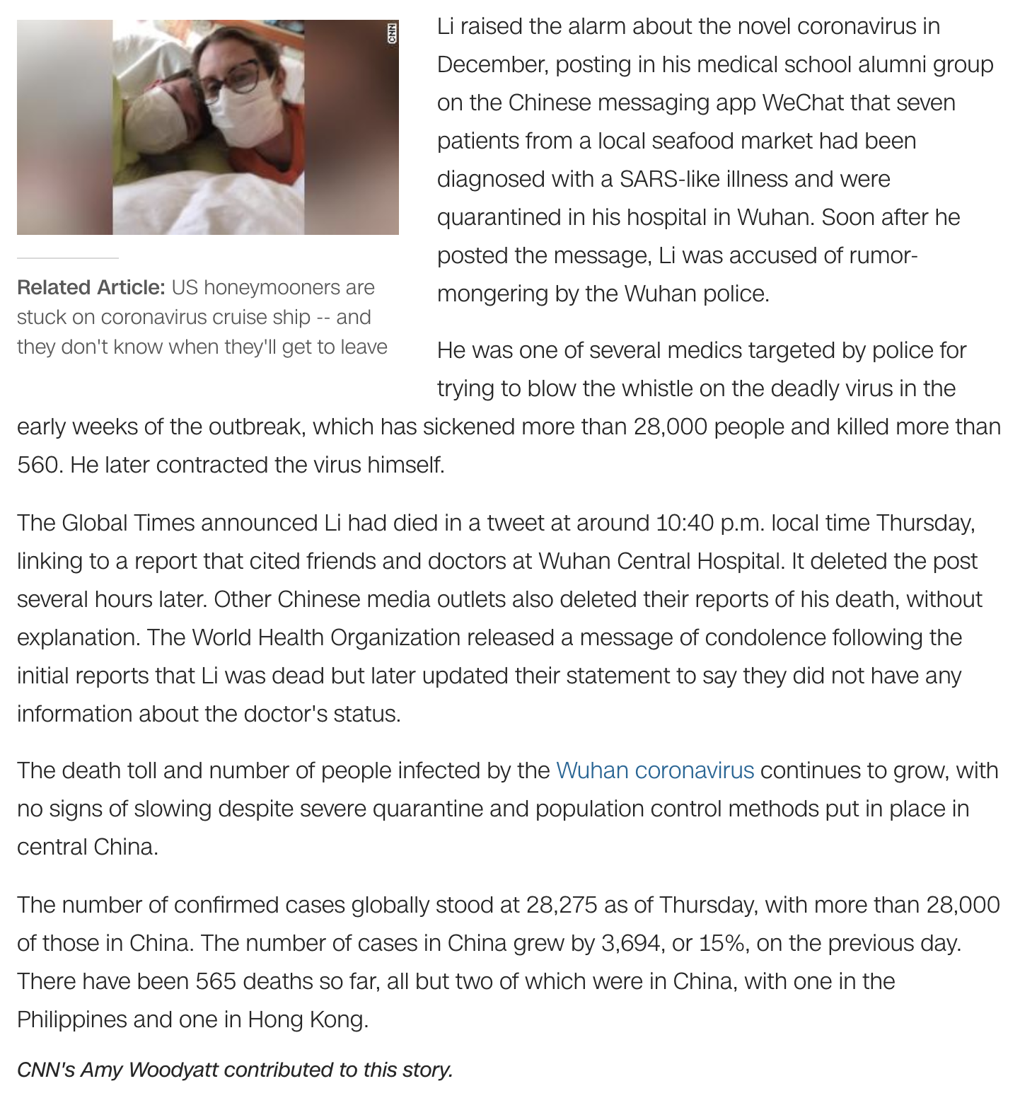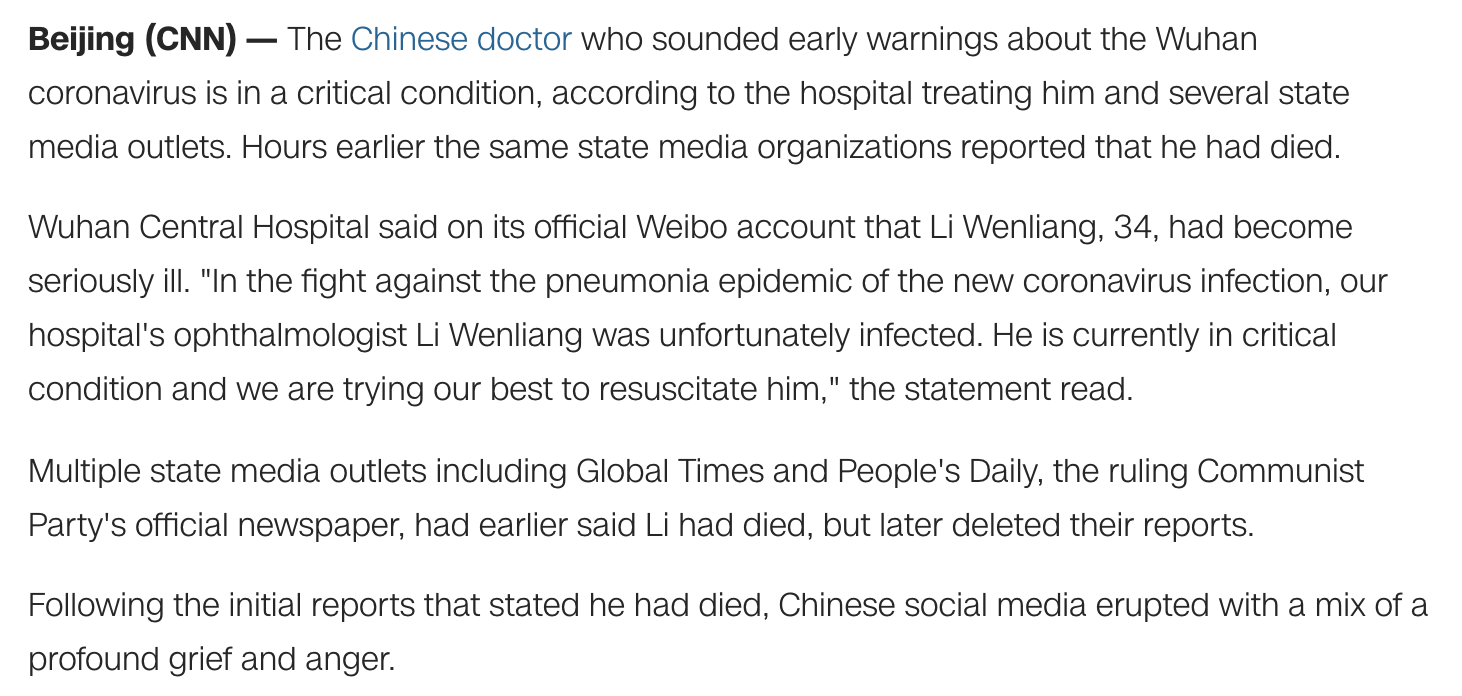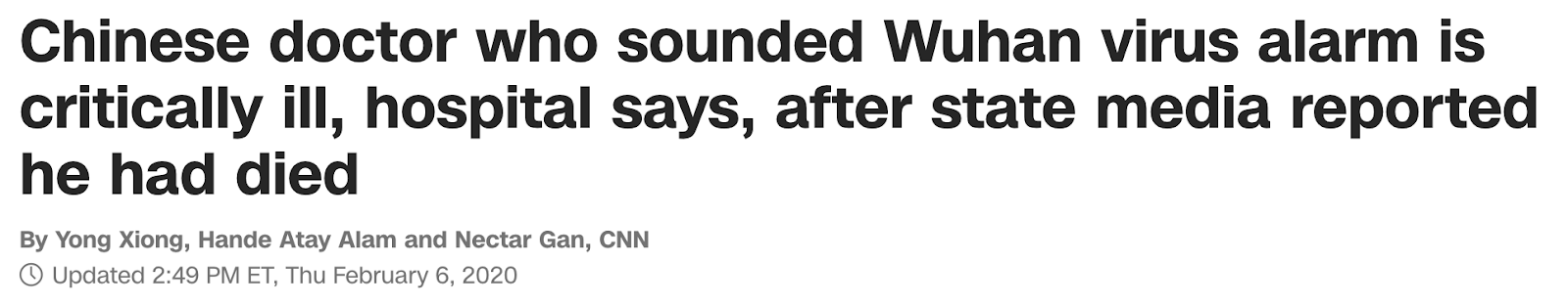 Chinese doctor who reported Wuhan virus reported dead, then retracted, February 6, 2020
