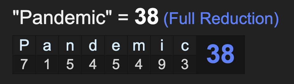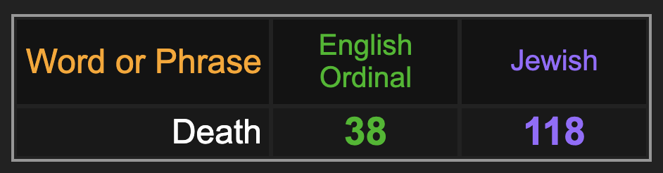 On the 38th day of the year (Death = 38), it is reported that 86 people were 86’d by the Coronavirus. Think about it.