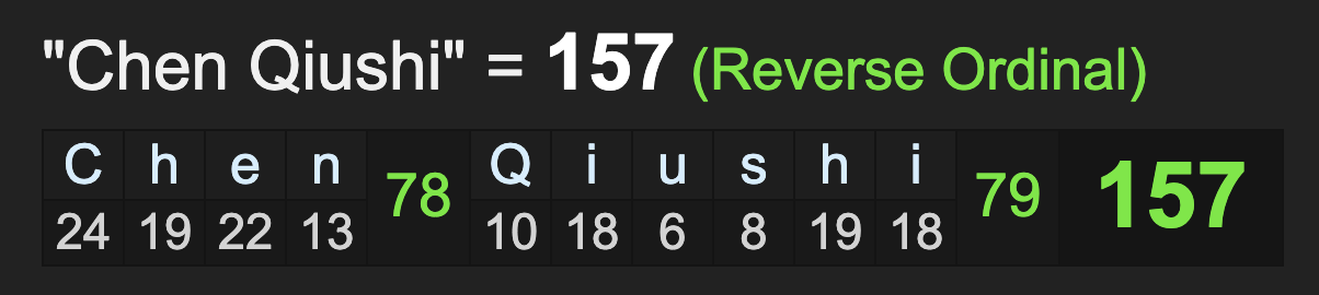 Thursday was the day the doctor was falsely reported dead, and then Friday was the day he was officially reported dead, so the opening paragraph needs some fact checking. Anyhow, notice the gematria of ‘Chen Qiushi’ beginning with 157.
