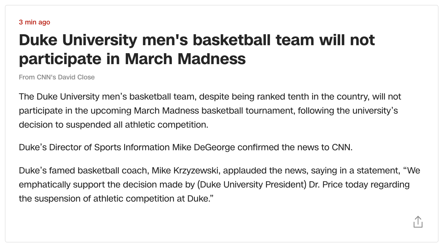Building on the March Madness news by the numbers of March 11, 2020, Duke is now abstaining from the tournament. Notice how Duke syncs up with Wuhan.