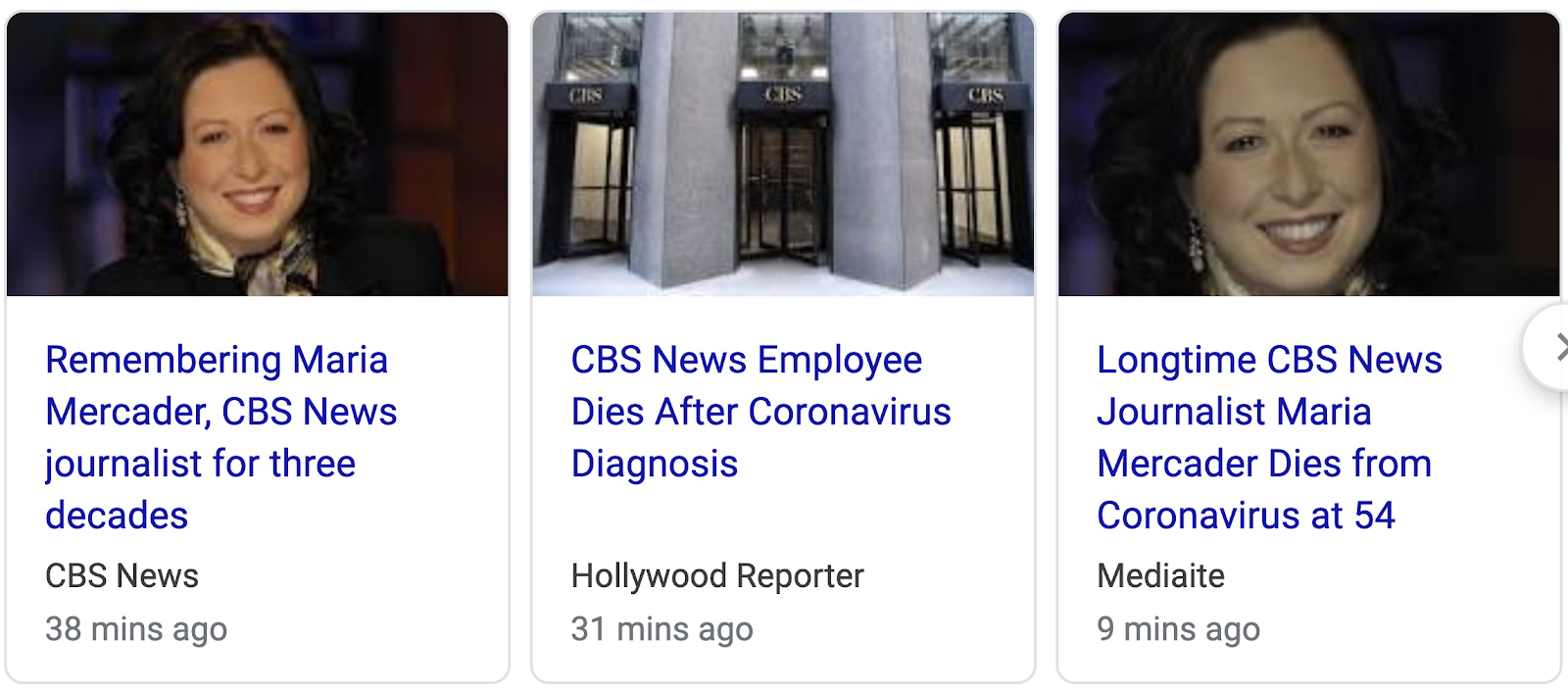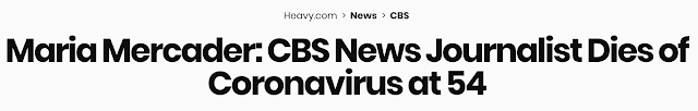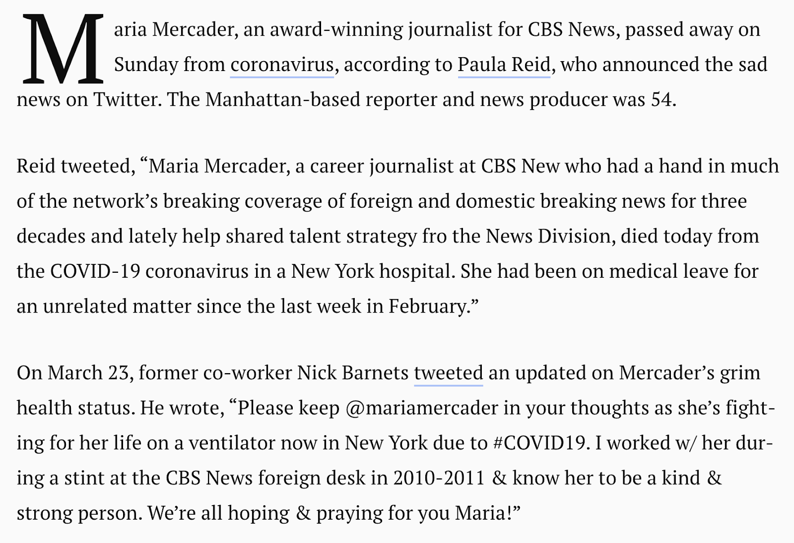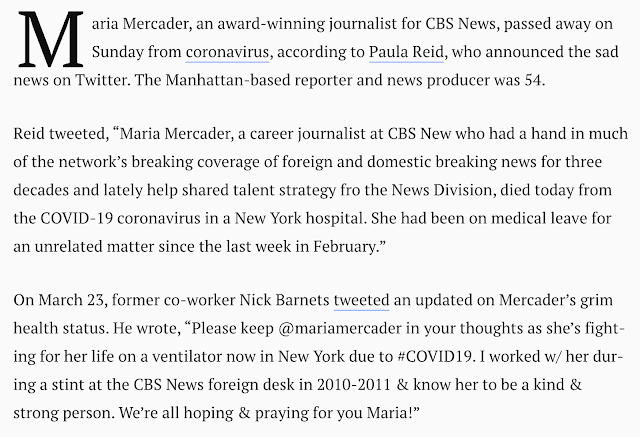 Maria Mercader of CBS has died Sunday, March 29, 2020, the 89th day of the year.